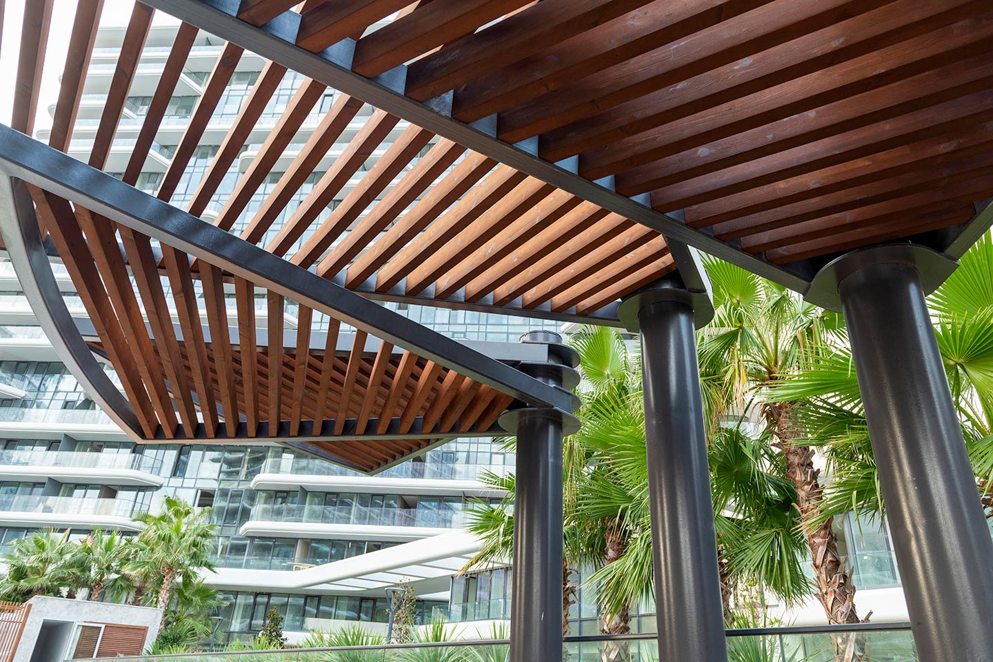 When crafted with special wood types, wooden sunshade offer an environmentally friendly and aesthetic design. Their warm tones and natural textures add elegance and sophistication to outdoor spaces, making them a functional and visually satisfying solution. With these qualities, wooden sunshade have become a preferred choice for various applications in modern architectural projects and outdoor designs.