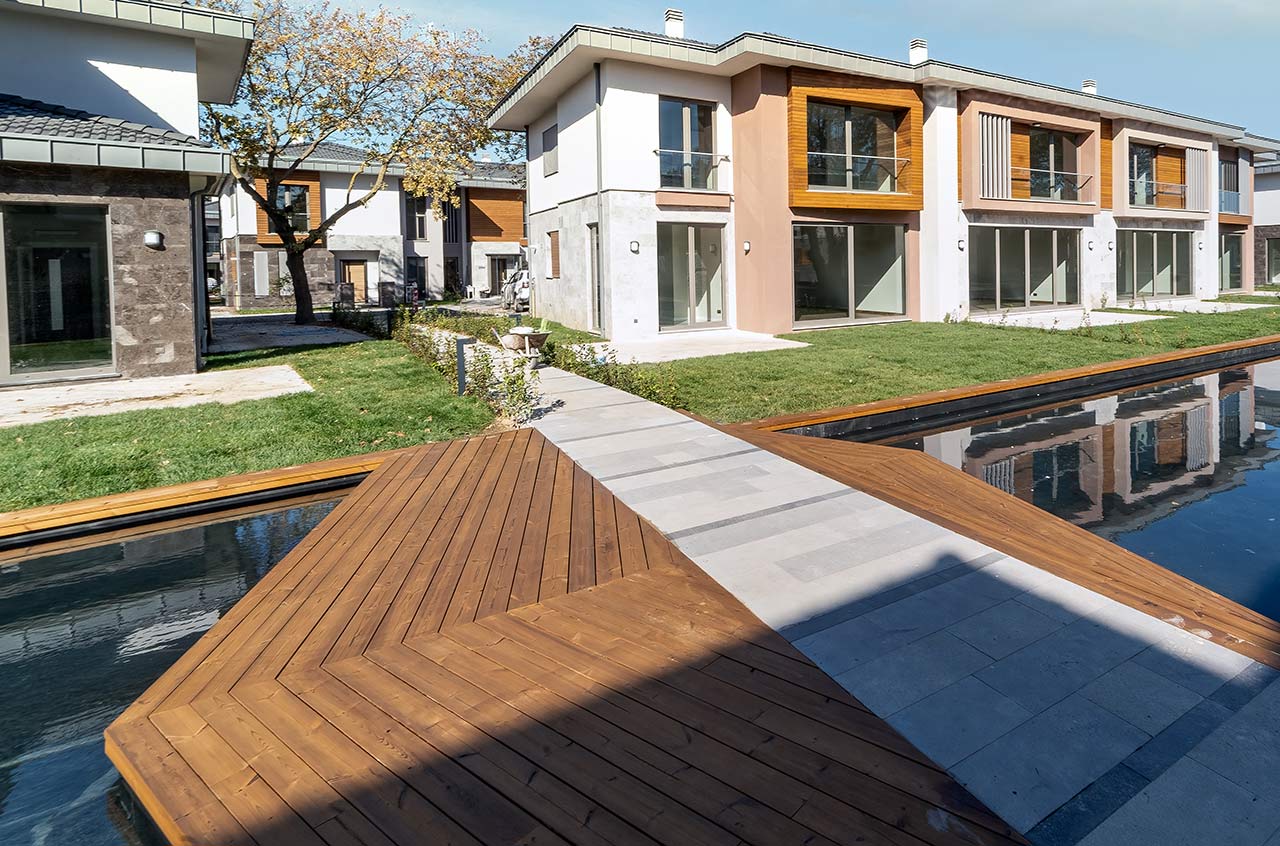 Thermally Modified Wood Pine Decking, highly suitable for outdoor use, adapts excellently to various climatic conditions. Its production is carried out in compliance with the norms and standards of the Design Coop.